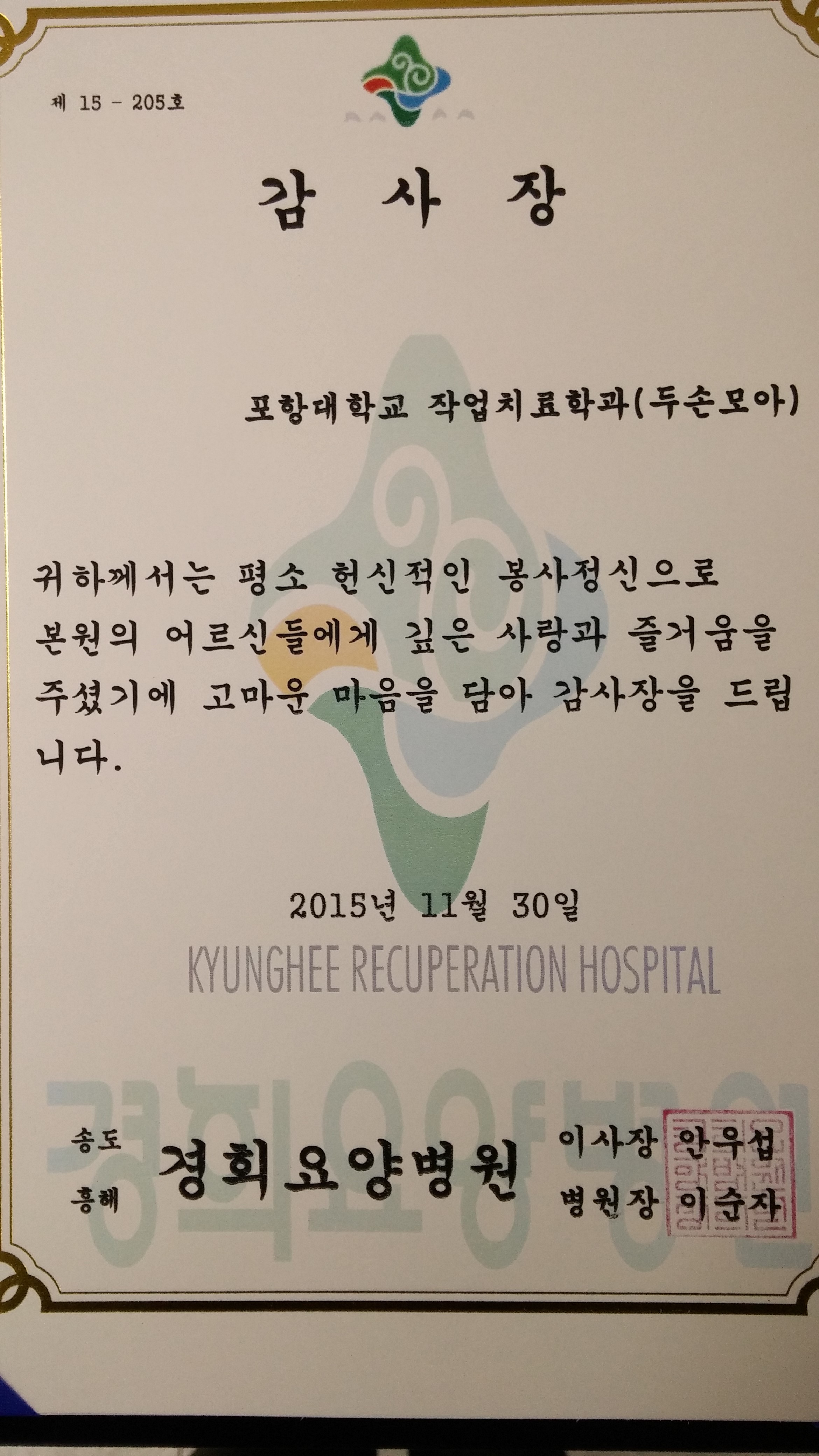 포항대학교 작업치료과의 봉사 동아리인 두손모아는2015년 11월 30일 경희요양병원에서감사장을 수여 받았다두손모아 동아리 회장인 김수향 학생은`` 선배들 부터 꾸준히 이어온 봉사활동을 계속하고 있는데나중에 임상에 나갔을때 좋은경험이 될 것으로 확신한다.계속해서 봉사활동을 이어나가 포항대학교 작업치료과의 이미지에 도움이 되길 바란다 `` 고 말했다이렇게 포항대학교 작업치료과는 지역의 어려운분들에게조금이나마 도움이 될 수 있도록 최선의 노력을 다 하겠습니다!