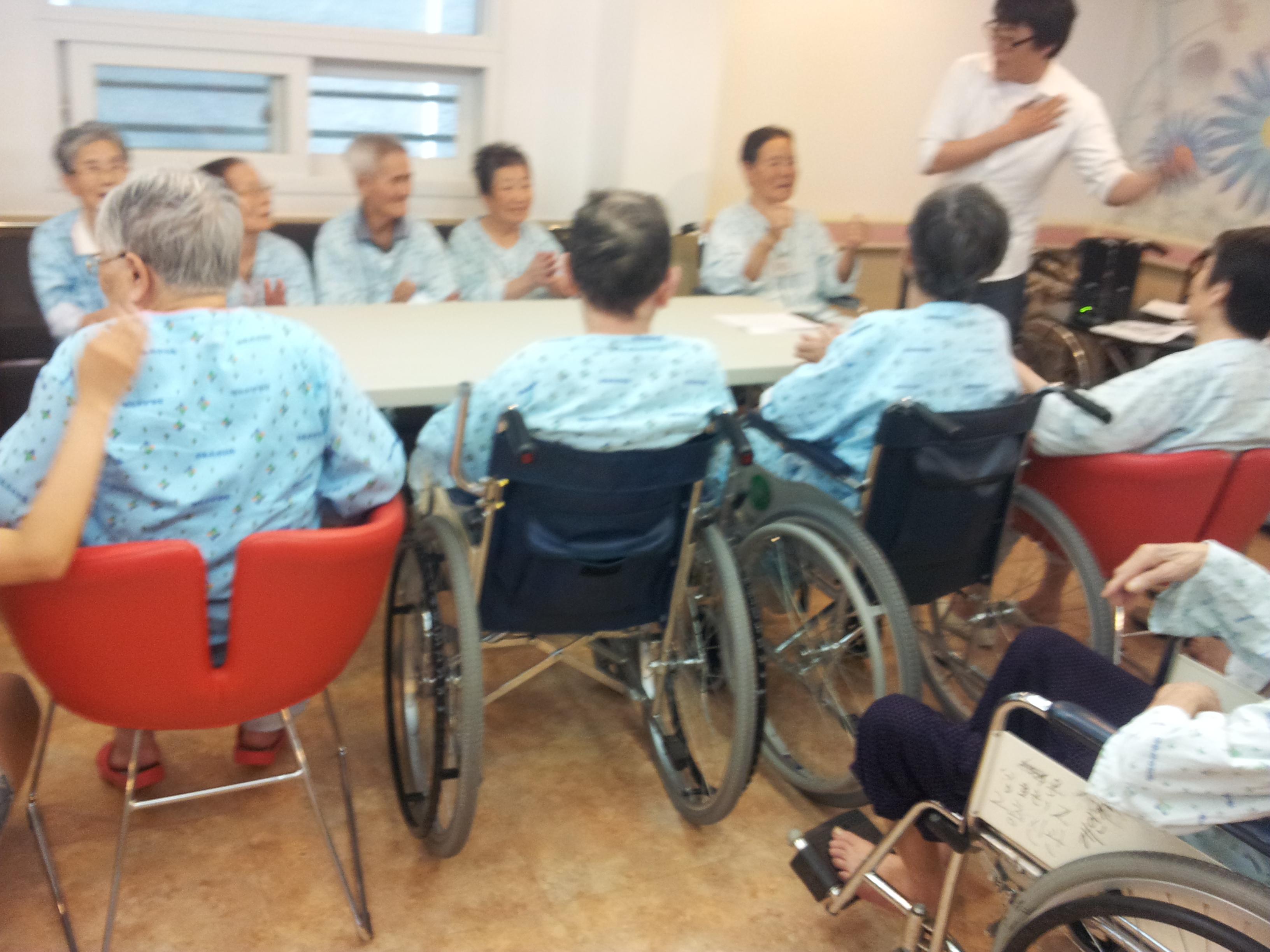 방학 중 교수님과 함께 요양원 어르신들과 프로그램을 하는 사진입니다